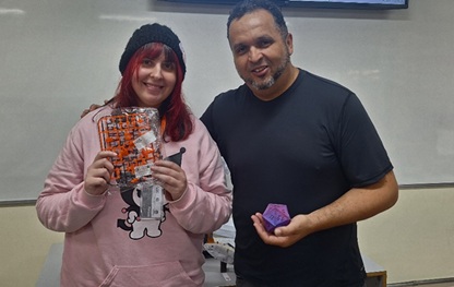 E em terceiro lugar ficou classificado o trabalho Dado de RPG, criação de Blue Sartori Pena (à esq.), que teve como premiação um pequeno quebra cabeças de um boneco de pose reutilizável.